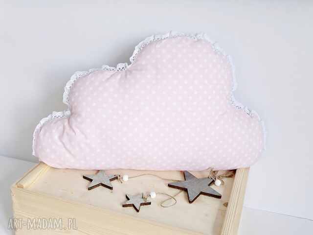 Poduszka w kształcie chmurki-idealny dodatek do pokoju dziecięcego. Poduszka wykonana jest z jasno-różowej bawełny w białe groszki i szarej melanżowej dresówki. Całość ozdobiona jest białą koronką bawełnianą. Poduszka wypełniona jest antyalergiczną kulką silikonową. Wypełnienie jest wszyte na stałe, ale bez problemu można prać poduszkę w pralce, gdyż wysokogatunkowa kulka silikonowa nie zbija się w praniu. Poduszka stanowi uroczy element wystroju pokoju dziecka i pięknie komponuje się z innymi poduszkami, kocykami i pościelą dostępnymi w sklepie Dots & Lace.