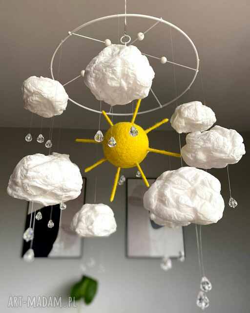 handmade mobil niemowlęcy z motywem słońca i chmurek - karuzela nad łóżeczko i dekoracja