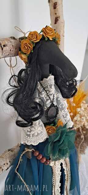 Mam do sprzedania własnoręcznie uszytego konika tildę. Ciałko uszyte z surówki bawełnianej, wypełnionej antyalergiczną kulką silikonową, barwiony na czarno z subtelnie zaznaczonym pyskiem i końcówkami kończyn - kolor antycznego złota i miedzi. Oczy wyszyte. Sukienka góra: koronka, koloru ecri, rozkloszowane rękawki, dół dwuwarstwowy: bawełna koloru butelkowej zieleni oraz wierzch tiul koloru butelkowej zieleni ozdobiony koronką bawełnianą koloru ecri, sznurkiem dekoracyjnym jutowym oraz różyczką tiulową i dwiema papierowymi. Włosy kręcone na końcówkach;koloru czarnego. Na głowie wianek z różyczek koloru antycznego różu. Może siedzieć bądź być zawieszony. Na szyi zawieszony czarny medalion. W rączkach trzyma koralikowe imię - zmienię stosownie do potrzeb:) Unikatowa dekoracja szczególnie dla miłośniczki koni;) Prezent z różnych okazji:) Długość 53 cm.