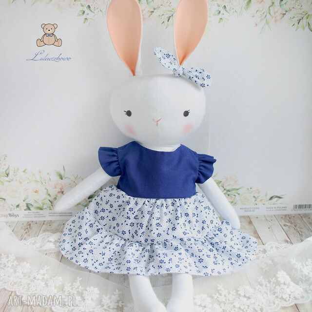 Przeurocza przytulanka, króliczek a właściwie królisia cała w bieli, uszyta ręcznie z najwyższą starannością, ubrana w granatowo-białą sukieneczkę z falbankami w drobne kwiatuszki. Wykonana ze 100% bawełny, wypełniona antyalergiczną kulką silikonową. Oczka malowane wodoodpornym markerem, nosek wyszyty muliną, uszko ozdobione kokardką. Sukieneczkę można swobodnie zdejmować, zapinana jest na rzep. Górne i dolne łapki układają się luźno, królisia siedzi z podparciem.