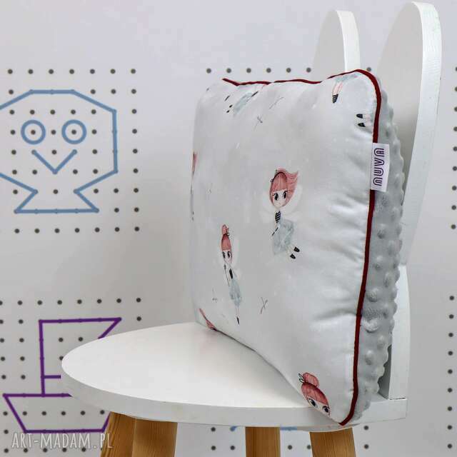 Poduszka szyta jest ręcznie z najwyższą starannością i dbałością o szczegóły. Jedna strona powstała z wysokogatunkowej bawełny, druga z polaru minky - doskonale miękkiego i w pięknych, nasyconych kolorach. Wypełniona jest natomiast antyalergiczną kulką silikonową, która nie zbija się i nie traci na sprężystości.