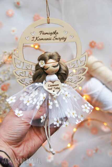 Ręcznie wykonana postać anioła osadzona na ażurowej, drewnianej obręczy zachwyca każdym detalem. Puszysta sukienka z białego tiulu zdobionego kwiatuszkami, włosy spięte kwiatkiem, a w rączkach - drewniane serduszko z wygrawerowanym napisem „Czuwam nad Tobą".