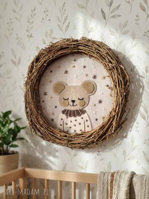 Ręcznie wykonany wianek dekoracyjny z filcową myszką, zaprojektowany jako subtelna ozdoba do pokoju niemowlęcego i dziecięcego. Delikatna forma, spokojna kolorystyka i naturalne materiały tworzą dekorację, która wprowadza do wnętrza ciepło i bajkowy nastrój, nie przytłaczając przestrzeni.