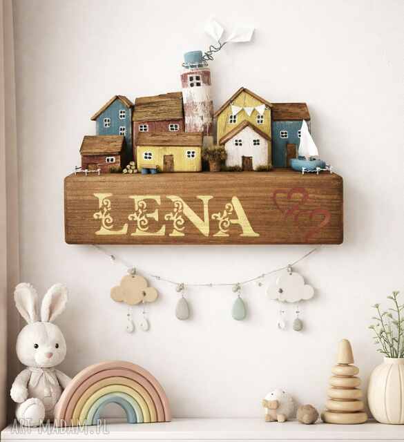Drewniany kolorowy wieszaczek, do dziecięcego pokoju. Pokoik dziecka handmade Wieszaczek z kolorowymi domkami i malowanym tłem, Dedykowany do dziecięcego pokoju, zawieszki370,00 zł