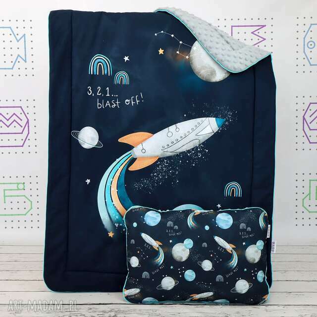 Zestaw Blast Off Granat to płaska poduszka i kocyk idealny dla Twojego dziecka. Zestaw pasuje do łóżeczka 120x60 cm